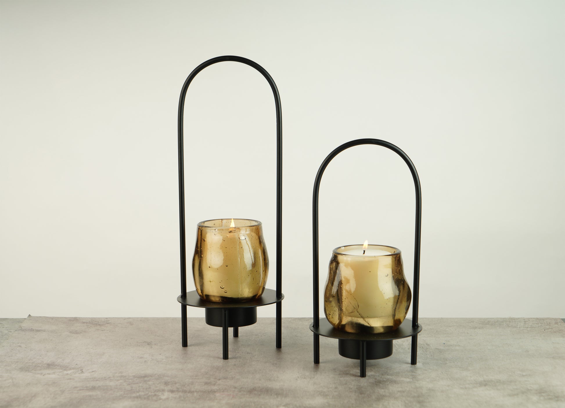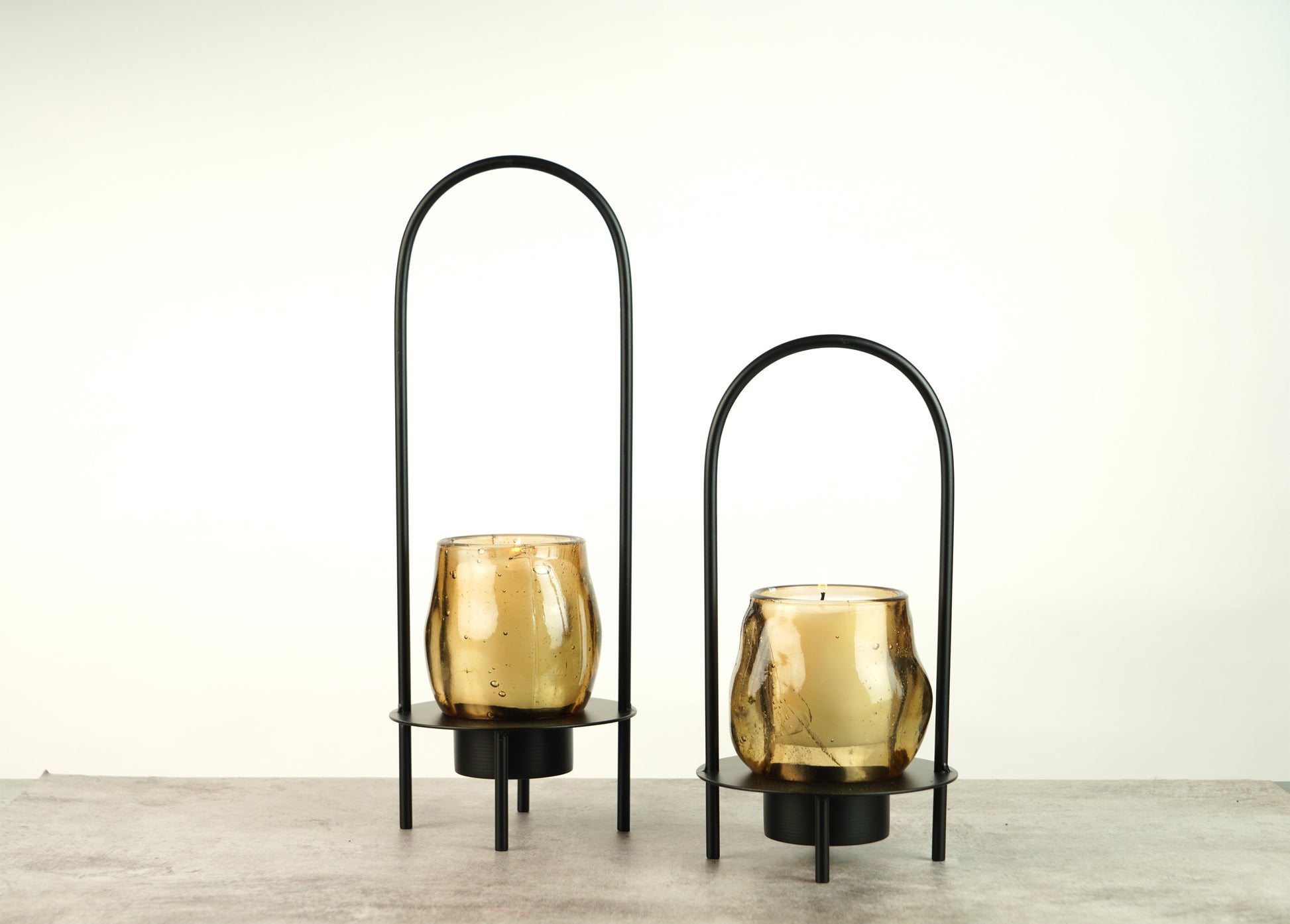 Amber Glass Lantern exudes both elegance and warmth, a perfect blend of sleek, modernity and timeless craftsmanship. The base, crafted from sturdy black metal, stands with an understated strength and atop this base rests the heart of the lantern: a globe of thick amber blown glass. Whether illuminated or resting quietly, this lantern stands as a testament to the beauty.