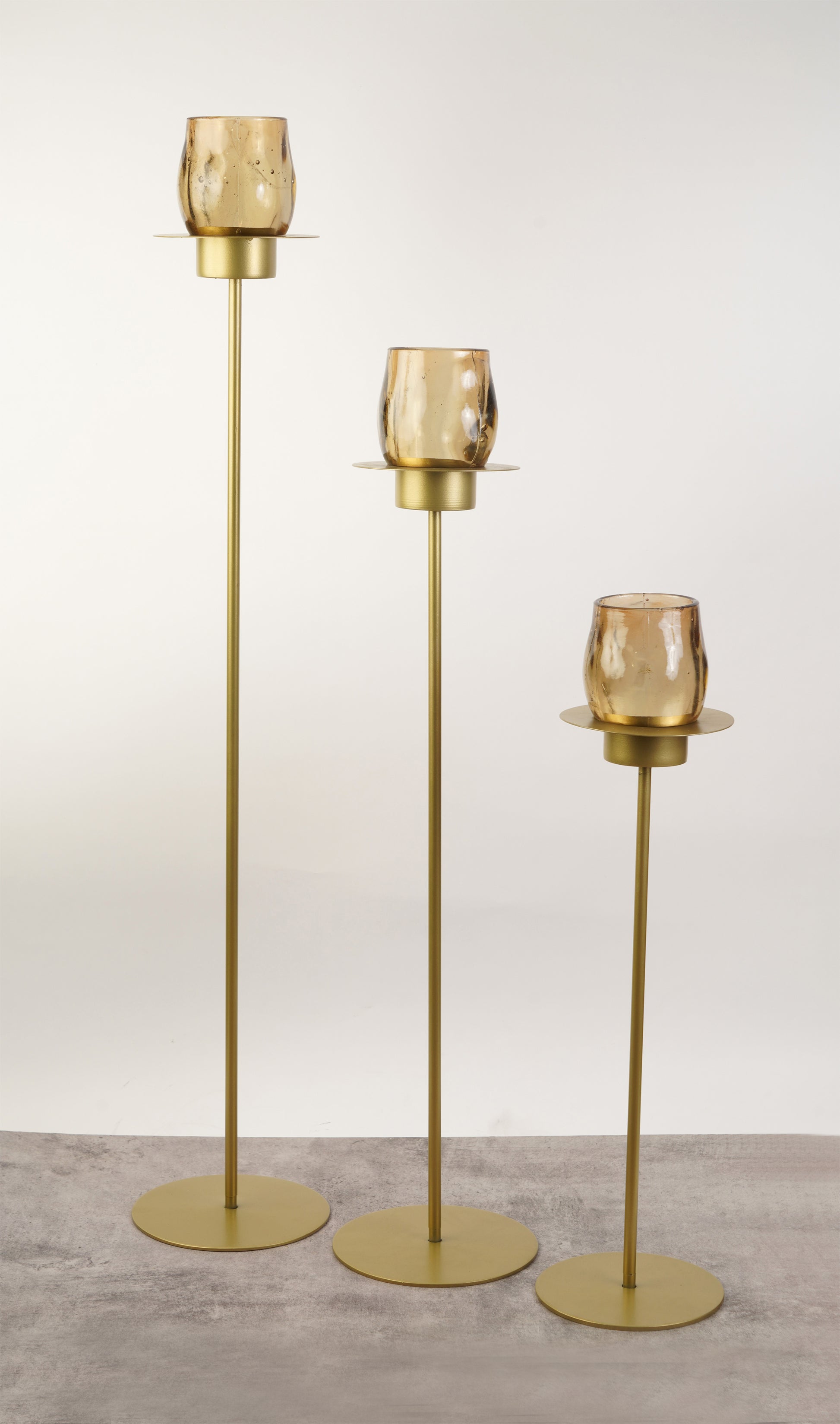 Tall Pillar holder epitomize opulence and grace, designed to adorn entryways or garden with a touch of sohphistication. Crafted from gleaming gold metal, its slender frame rises elegantly, lending a regal presence to any space it graces. The combination of radiant gold and amber infuses the surroundings with luxurious ambiance.