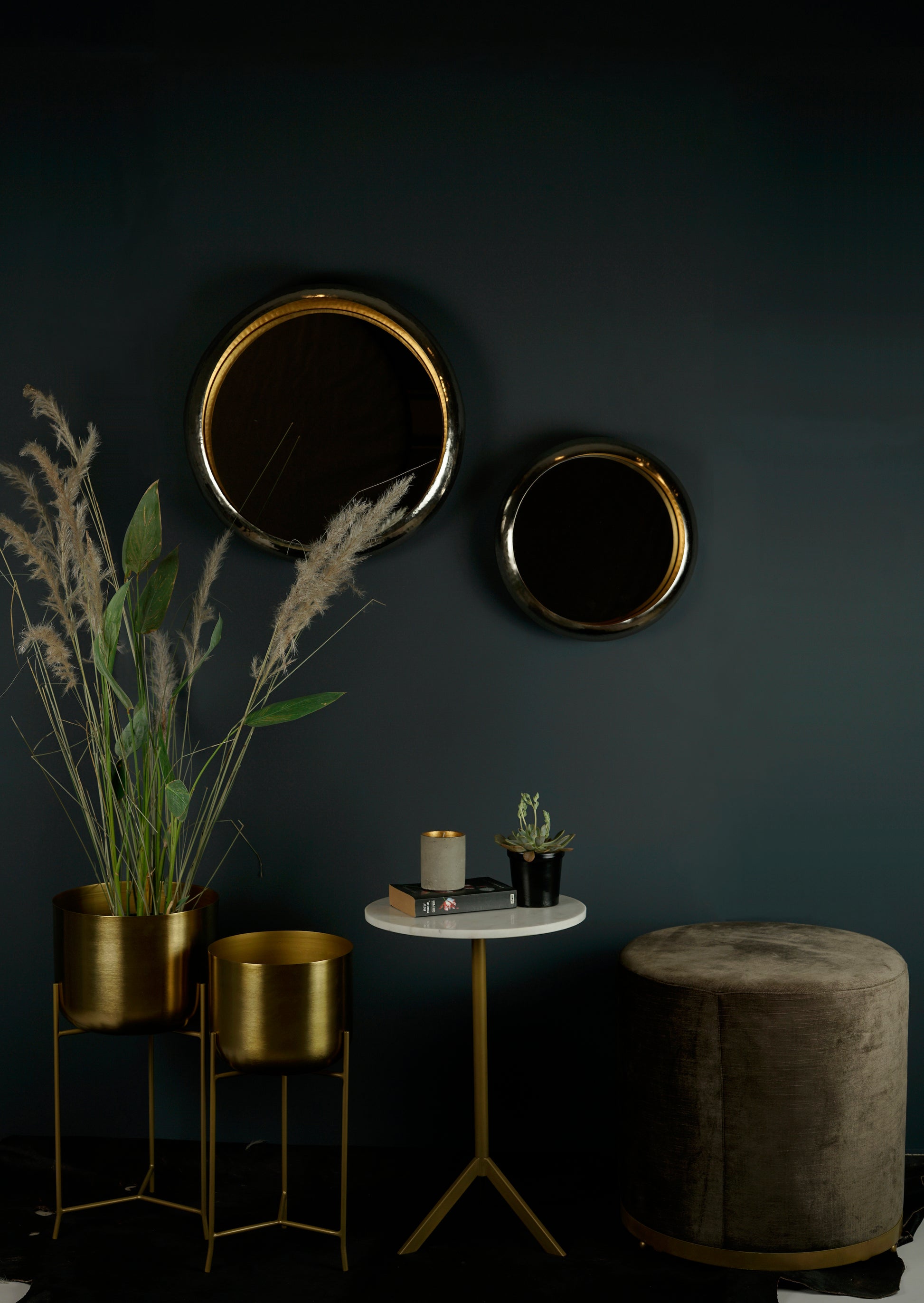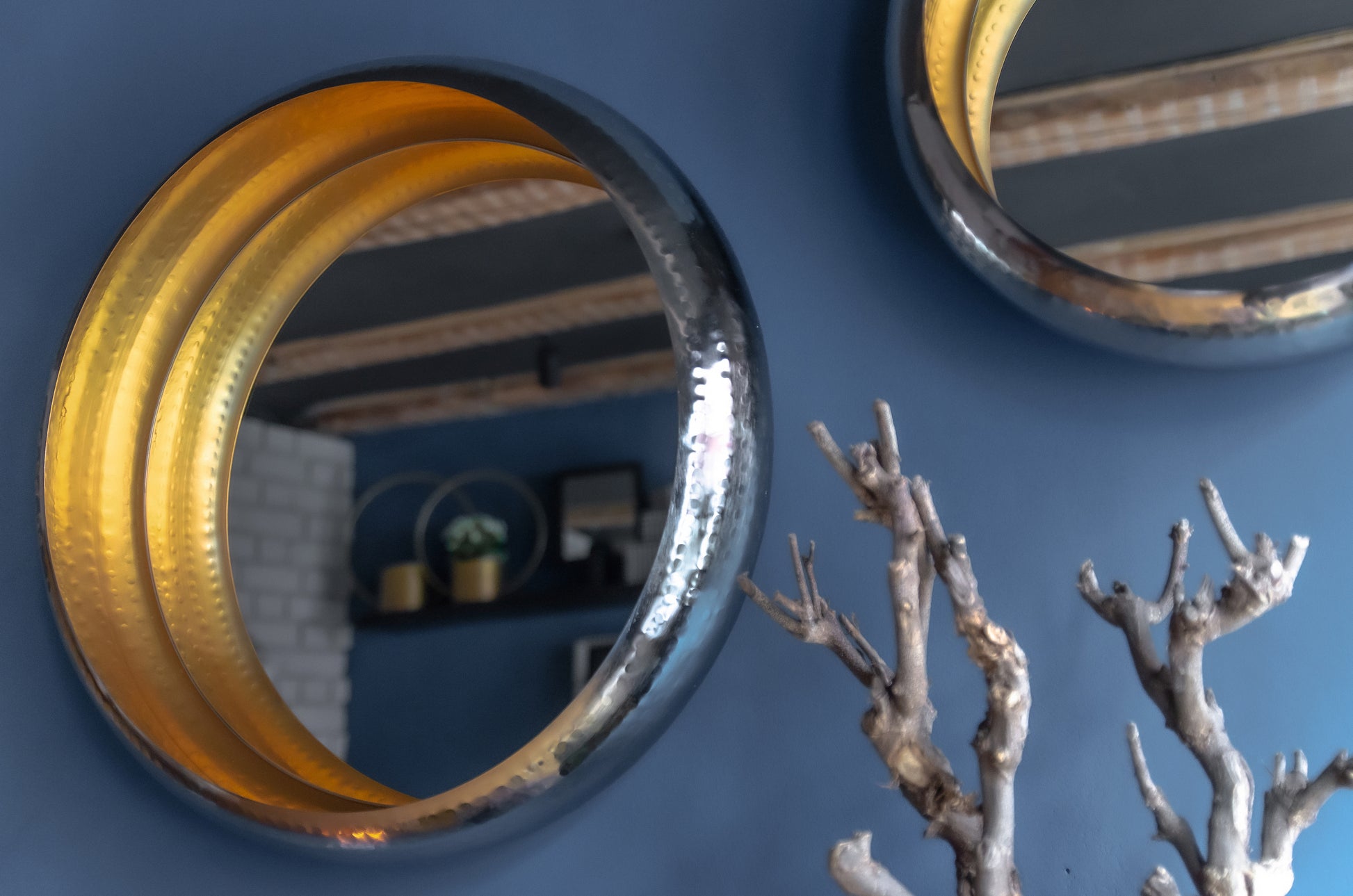 A frame that extends beyond the mirror, this decorative wall mirror takes on a three-dimensional aura. These Round Nested Mirrors are living room worthy or use them to beautify your Bed Room or Entryway.